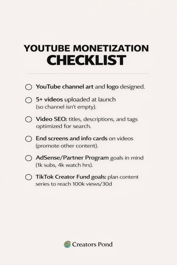 Monetization Prep: To earn from ads, aim to join the YouTube Partner Program (requires 1,000 subscribers and 4,000 watch hours in 12 months). Even before that, you can monetize through affiliate links in descriptions or by promoting products.